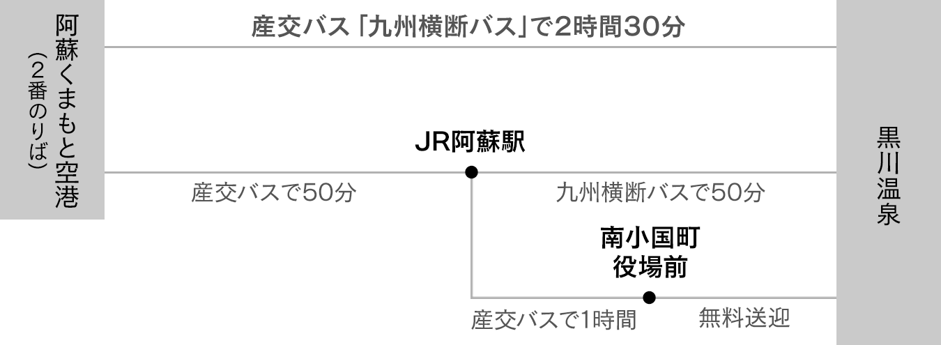 空港から黒川温泉まではレンタカーまたはバスをご利用ください。バスの場合ですと以下のコースをおすすめいたします。また、黒川温泉、南小国町役場前、杖立の各バス停までは無料送迎いたします。ご予約の際にお申し付けください。